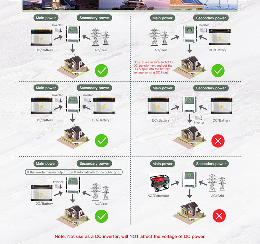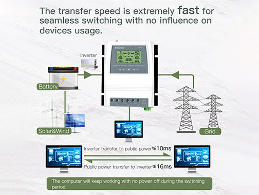 ⚡ Auto-Switch Between Grid & Battery – Automatically transfers power sources during outages or low voltage, ensuring uninterrupted electricity for your solar/wind system.