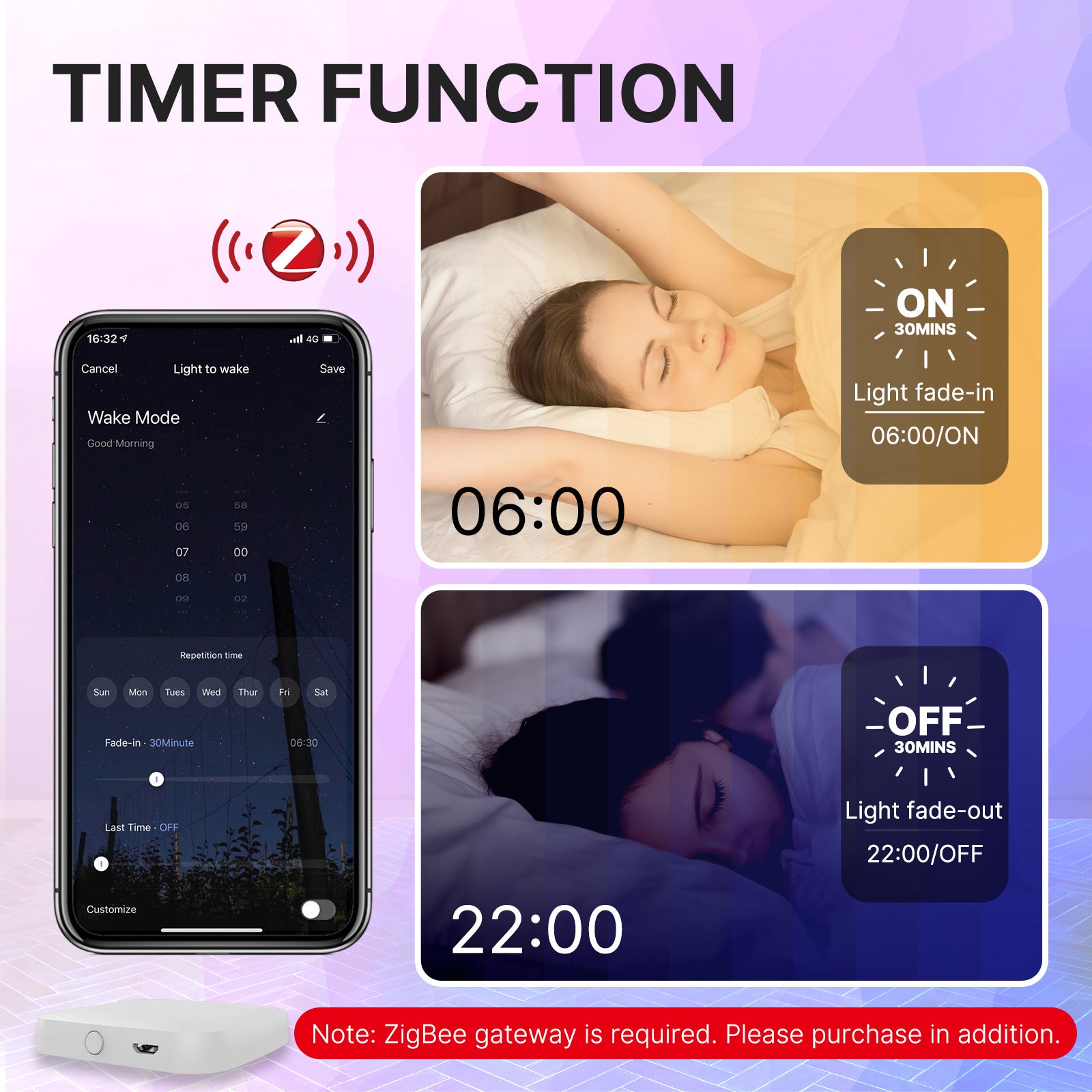 • Timer Function: The bulb can be turned on or off according to a preset schedule. In sleep/wake mode, the gradual changes is friendly to your eyes, in case the uncomfort by quick changes.