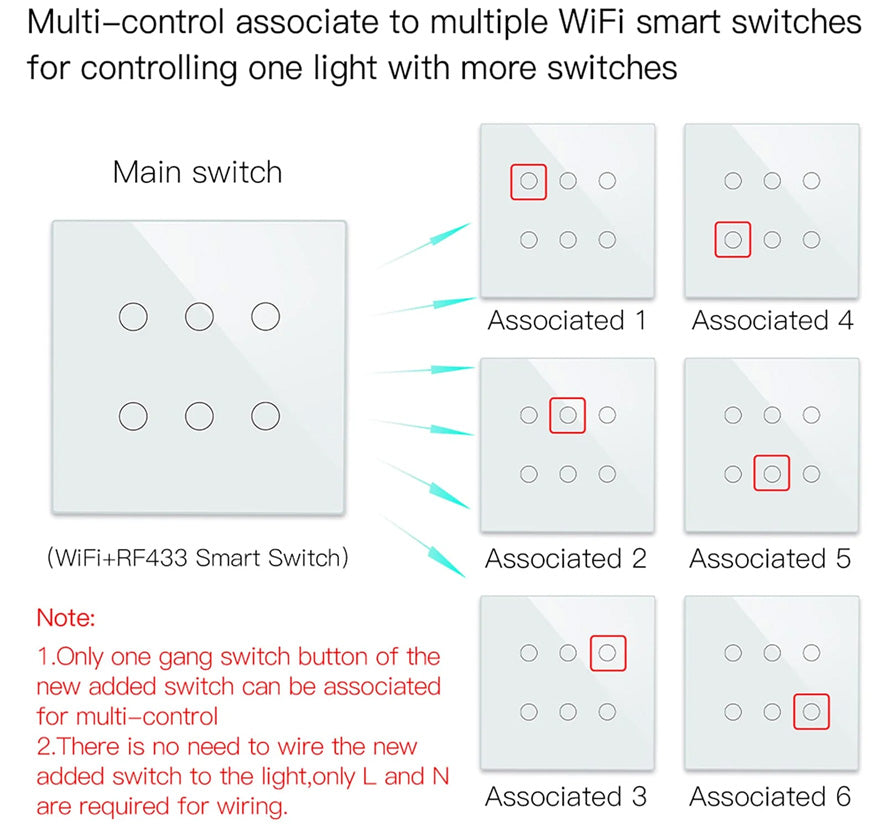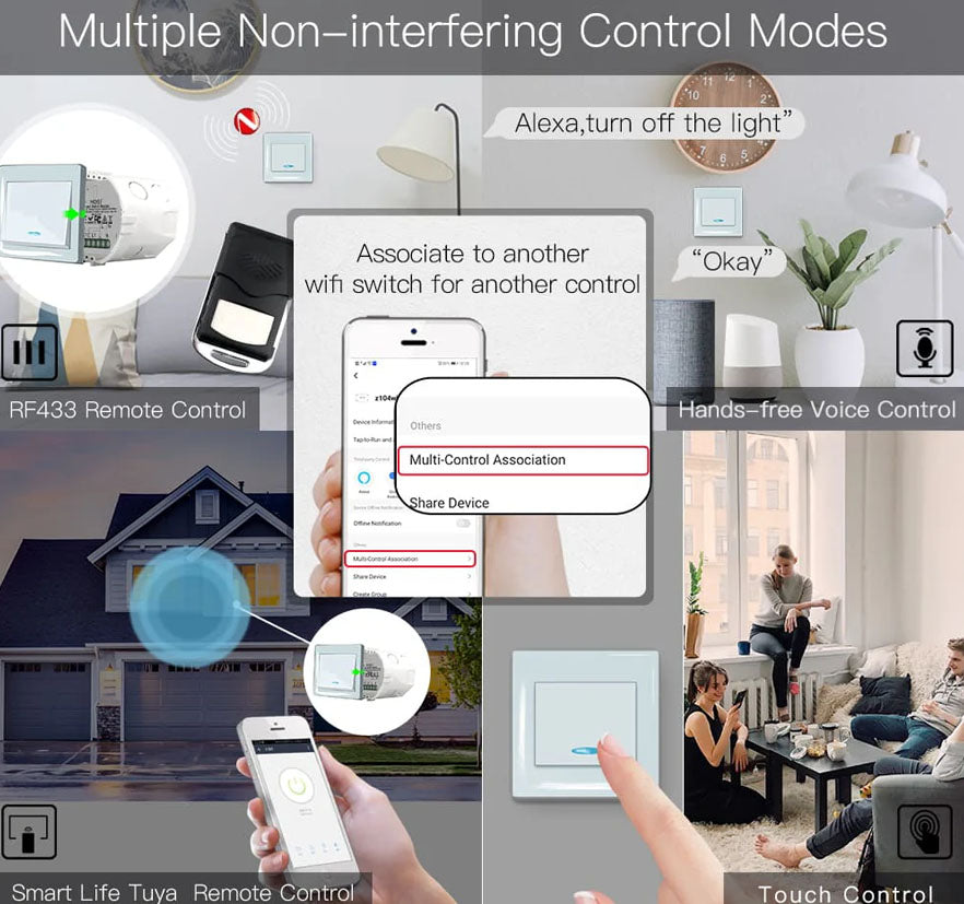 Effortlessly manage your lighting with multi-control functionality, allowing you to associate multiple WiFi smart switches to control a single light. This feature provides flexible and convenient control across various switches without the need for rewiring; simply connect the new switch using L and N. Note that only one gang button on the added switch can be linked for multi-control. Enjoy non-interfering control modes, including hands-free voice commands, to seamlessly integrate with your smart home system.