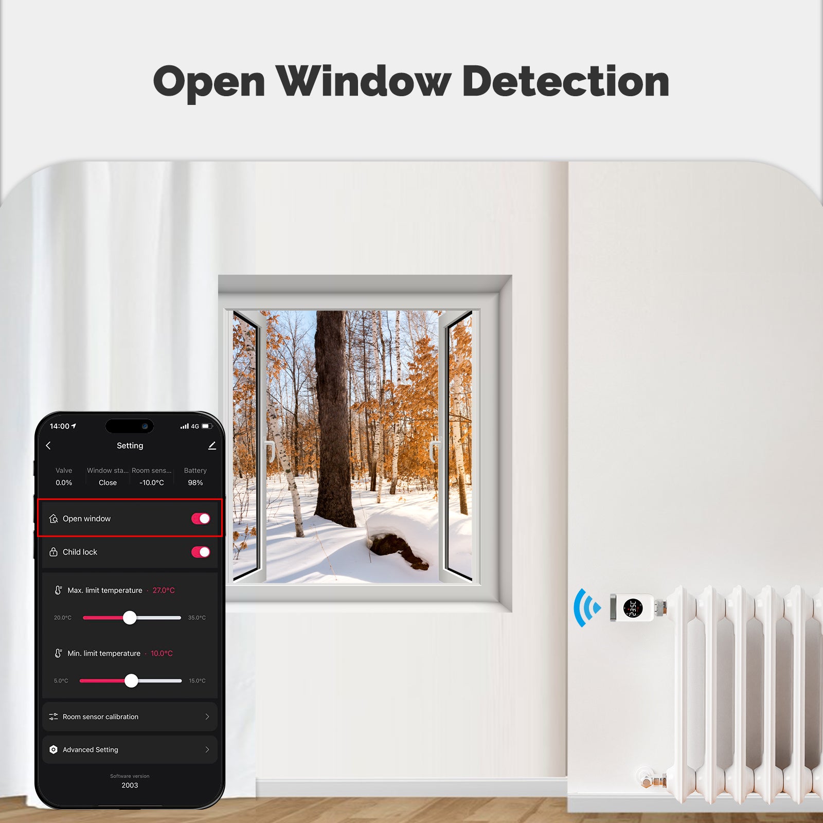 • Smart Energy Savings - Auto-detects open windows (temperature-drop detection) and adjusts heating