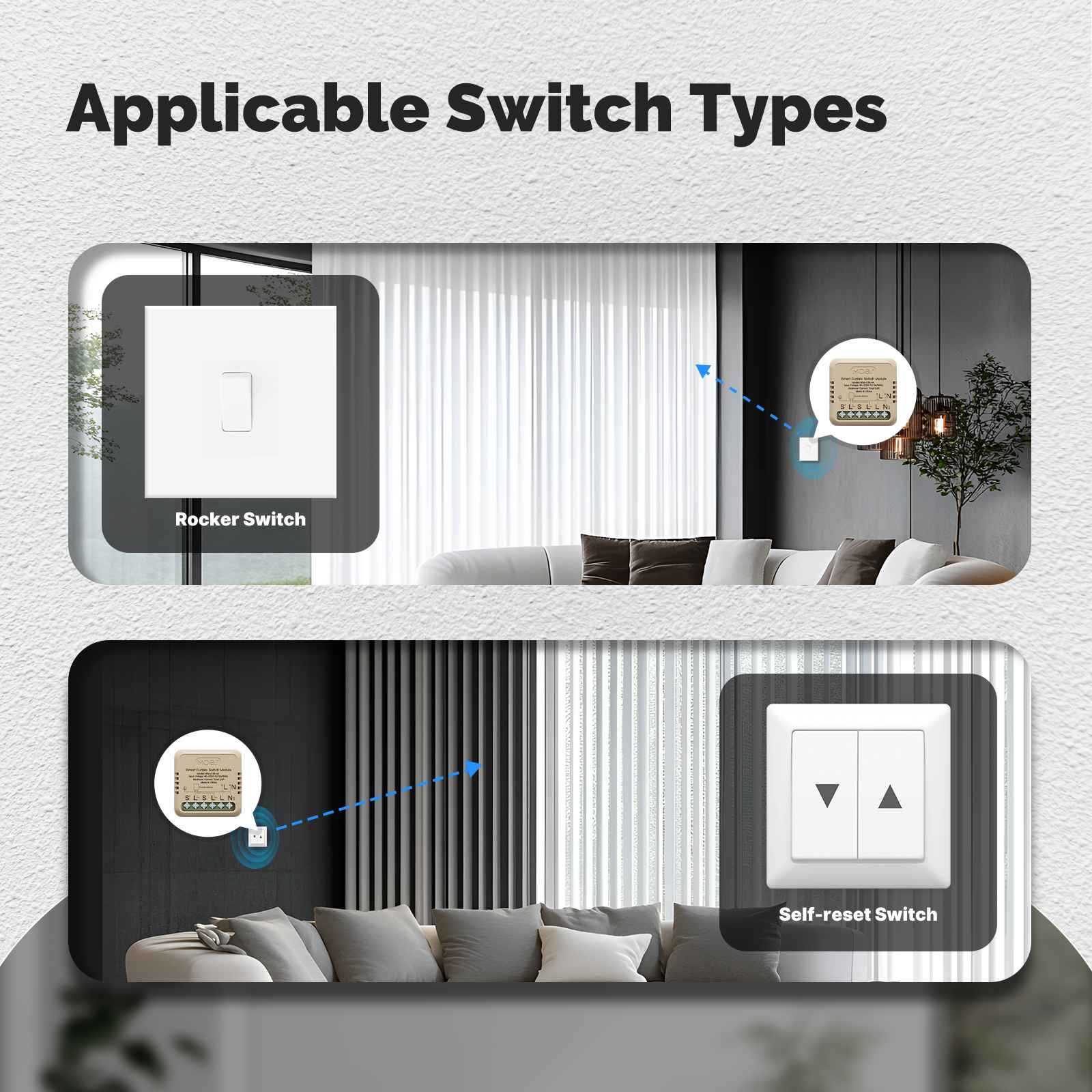 You can choose a rocker switch or a self-reset switch, which is compatible with common switch types on the market and convenient for users to carry out smart transformation.