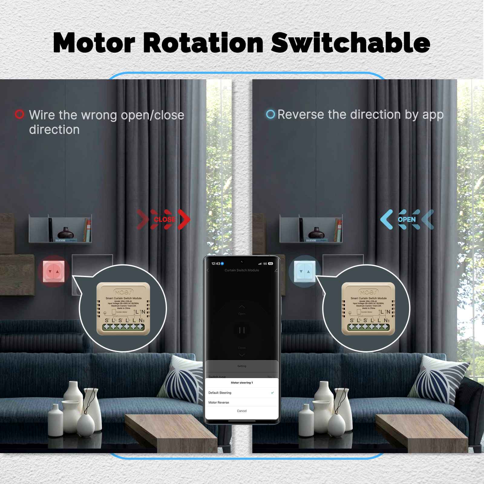 According to the installation direction, you can adjust the correct switch direction with one click in the APP to ensure that the curtains are opened and closed correctly.