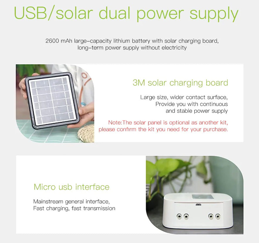 The USB/solar dual power supply system features a 2600 mAh large-capacity lithium battery paired with a 3M solar charging board, providing reliable long-term power without the need for external electricity. The large solar board ensures a wider contact surface for continuous and stable energy. Equipped with a micro USB interface, it supports fast charging and quick data transfer. The system also includes wireless remote control via the app, allowing you to intelligently manage watering for your house plants from anywhere, ensuring they receive adequate water and nutrients.